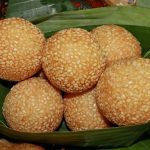 • Pipihkan adonan kulit kemudian letakan adonan isi di tengah dan bentuk jadi bulat. Celup adonan bulat ke air dan gulingkan pada wijen putih.
